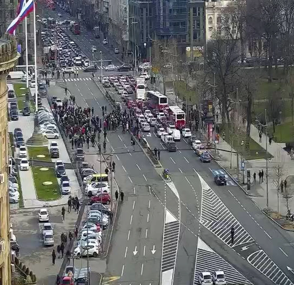 Saobraćaj ispred Skupštine Srbije trenutno je blokiran, odnosno zatvorena je jedna trka, ona koja vodi dalje ka Trgu Nikole Pašića i Terazijskom tunelu.