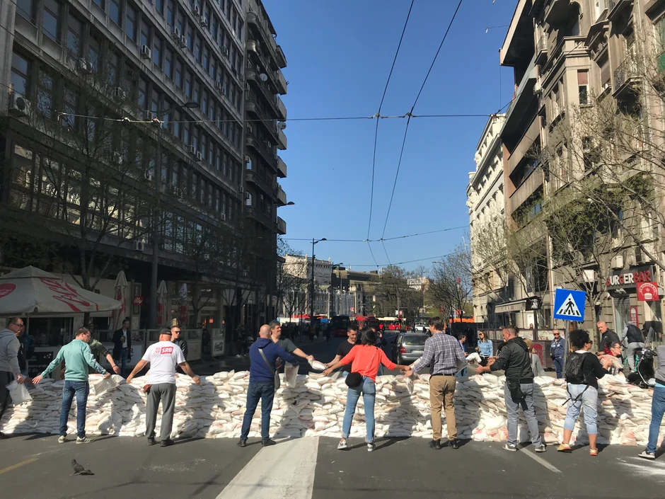 Kako javlja reporter "Blica", okupljeni su postavili improvizovani zid od džakova na Terazijama zbog čega je bilo nemoguće doći do Trga republike.