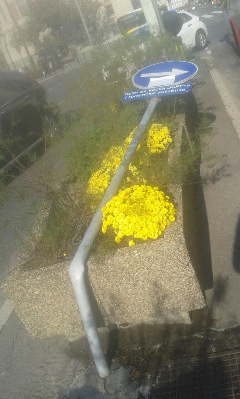 Saobraćajni znak koji označava uslovno skretanje desno, osim za taksi i vozila GSP-a, u centru Beograda jutros je ekipa "Blica" zatekla položenog među cvećem.