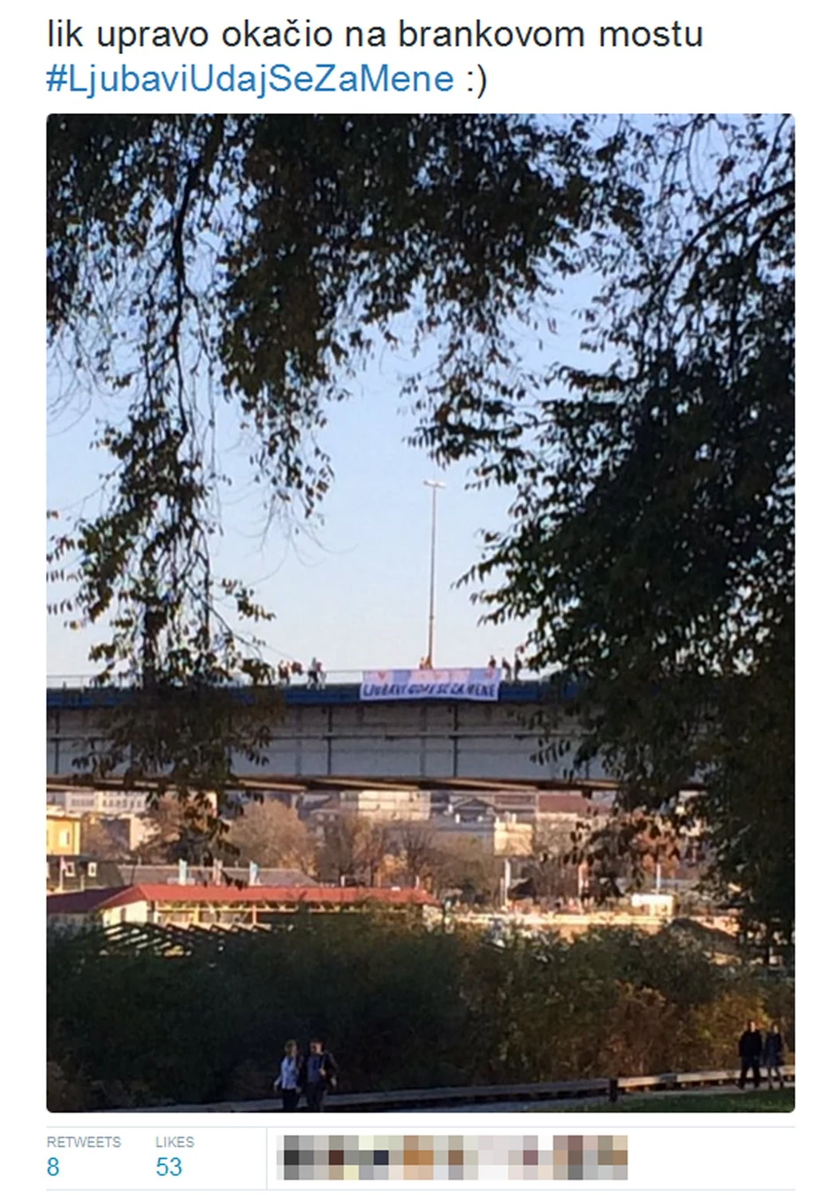 Okačivši ljubavnu parolu "Ljubavi udaj se za mene" nasred Brankovog mosta, nepoznati mladić je odlučio da zaprosi svoju devojku i tako dobije titulu najromantičnijeg sugrađanina.