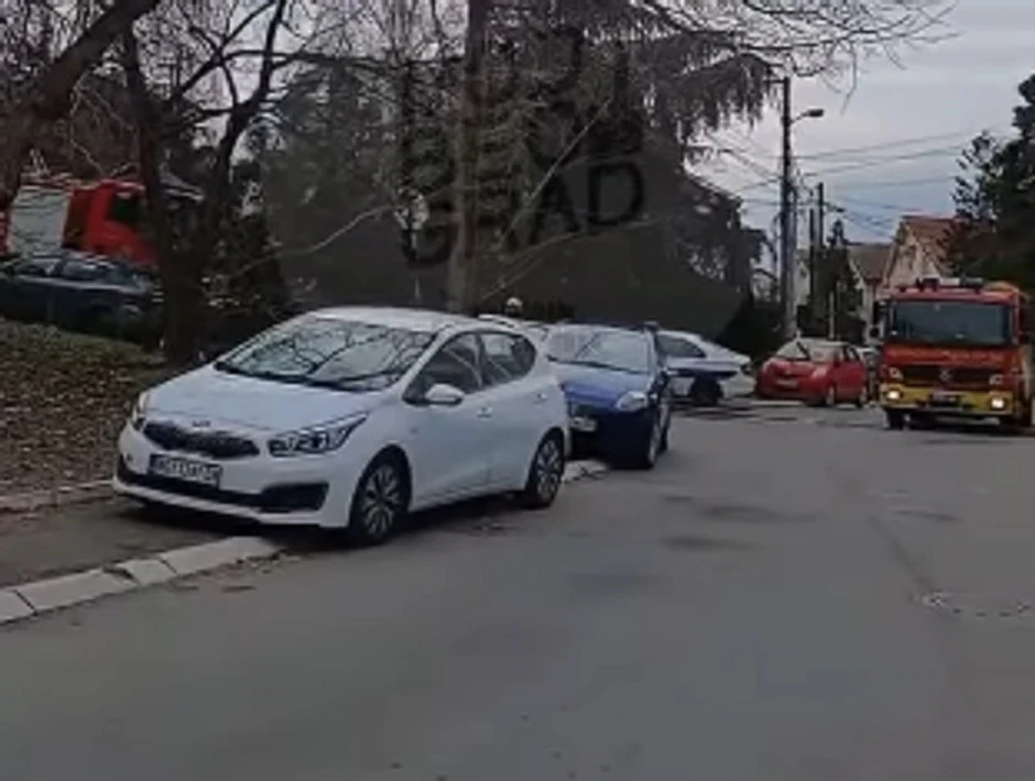 Kako se može videti na snimku ispred petospratnice na Banovom brdu parkirano je nekoliko vatrogasnih vozila, dok policija obezbeđuje teren.