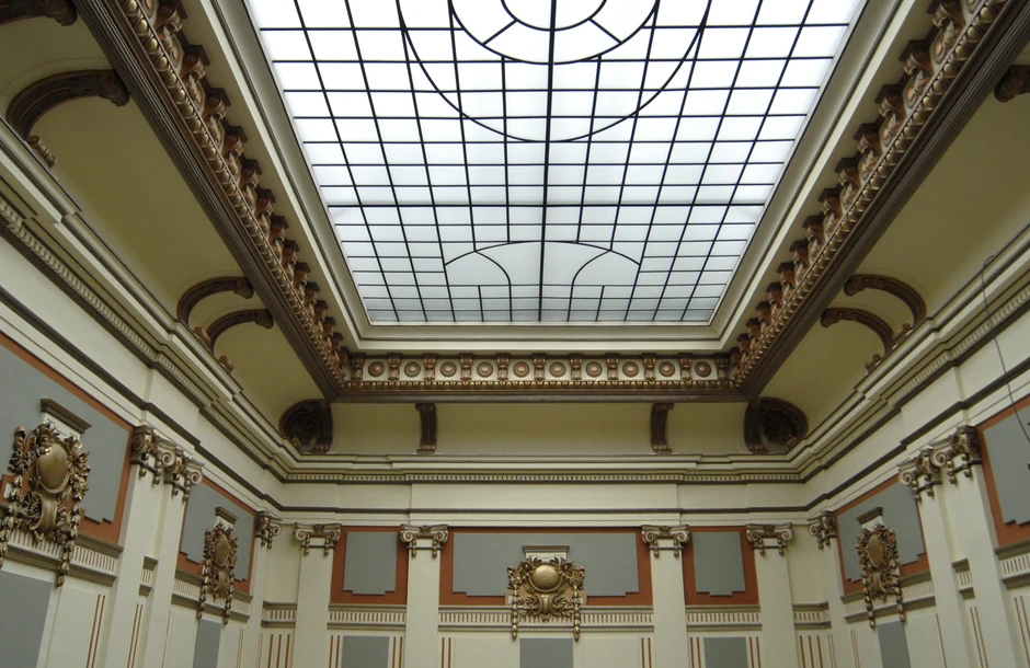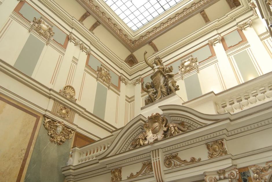 Enterijer zgrade je jedan od najlepših u beogradskoj arhitekturi. Na početku mermernog stepeništa u glavnom holu postavljene su dve pandan figure mlade žene u vidu kandelabra, dok se iznad galerije u glavnom holu nalazi Afrodita sa dva amora.