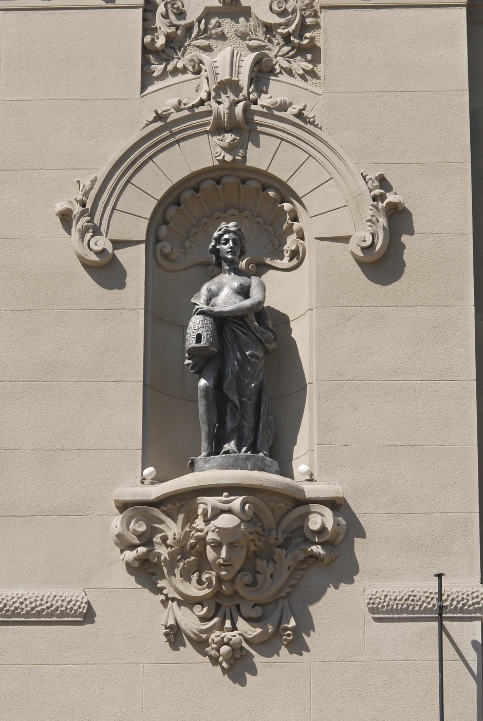 U nišama na bočnim rizalitima glavne fasade postavljene su figure Žena sa košnicom i Muškarac sa svitkom. Brojni reljefi u vidu ženskih maski nalaze se na vrhovima lezena, iznad prozora prvog sprata i u visini prozora prizemlja na bočnim fasadama, dok je nad ulazom postavljena maska Merkura.