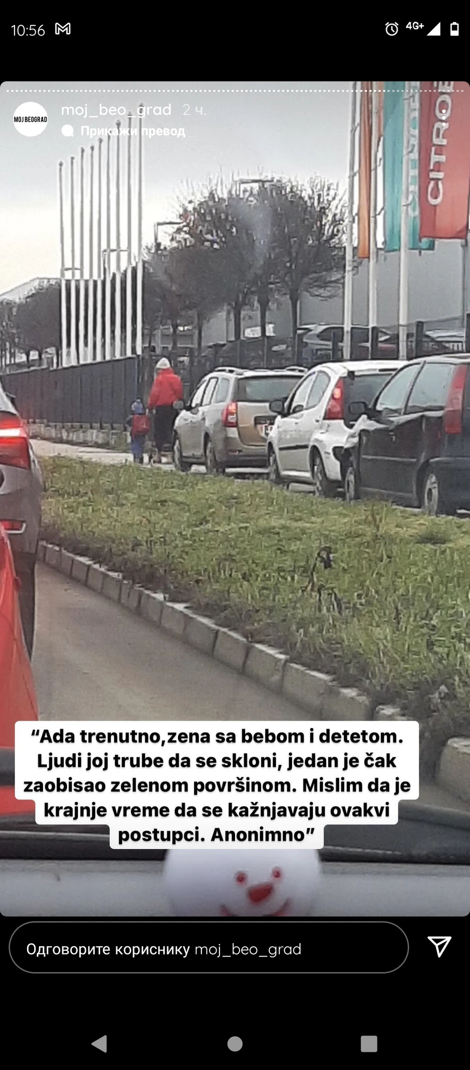 - U situaciji od jutros čovek iza mene mi je čak i svirao da se sklonim, turirao vrlo glasno verovatno da me uplaši, i očigledno ne mareći hoće li uplašiti moju decu ili psa, što je za mene vrhunac svakog bezobrazluka. Nisam želela da odstupim ni milimetar, išla sam brzinom kojom je mom detetu bilo normalno da se kreće - piše sugrađanka.