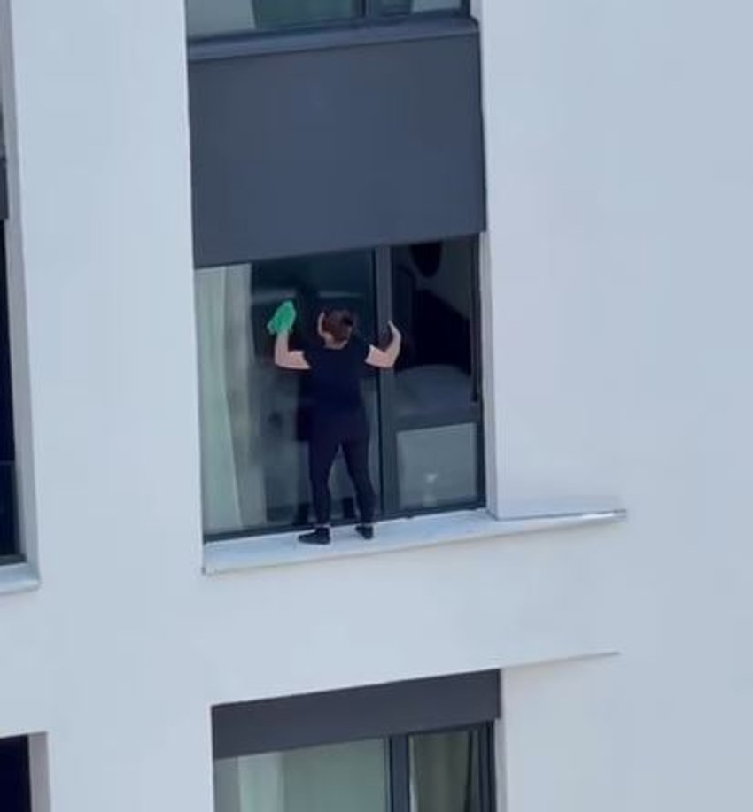 Ona s takvom opuštenošću stoji i glanca prozore sa spoljašnje strane, kao da je na prizemlju! Naravno, nikakvu zaštitnu opremu nema.