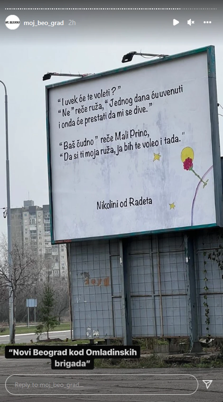 On je, naime, odlučio da na bilbordu napiše jedan citat iz knjige "Mali princ" Antoana de Senta Egziperia i posveti ga jednoj devojci.