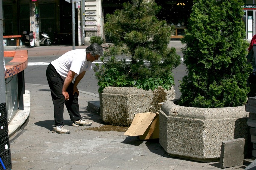 U centru grada svoj dom pokušala je da nađe i jedna neobična porodica. Sa brojem članova od minimum stotinu, roj pčela, prateći maticu, doleteo je juče ispred Palate "Albanija", da bi onda na čuđenje prolaznika pčele počele da sleću u žardinjeru.
