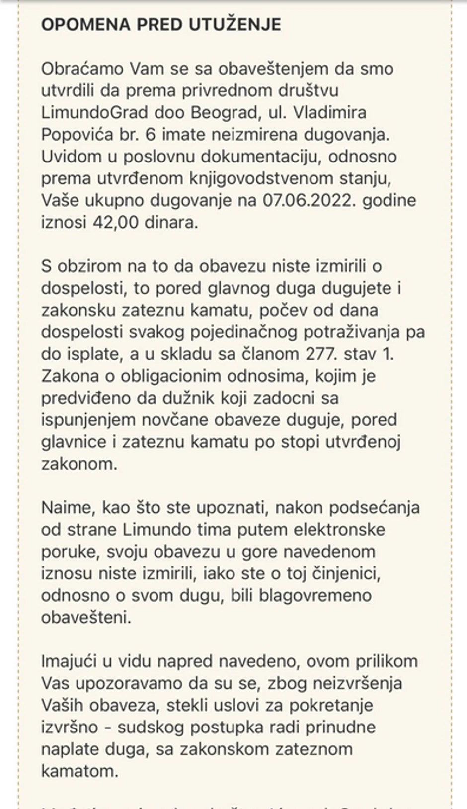 On dalje navodi kako Limundo na slanje opomene pred utuženje svakako ima zakonsko pravo, te da to u ovom slučaju nije sporno.