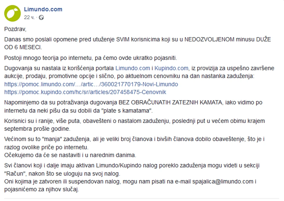 Tokom jučerašnjeg dana firma Limundo oglasila se ovim povodom na svom Fejsbuk profilu i naglasili kako su tokom 7. juna poslali opomene pred utuženje svim korisnicima koji su u nedozvoljenom minusu duže od šest meseci.