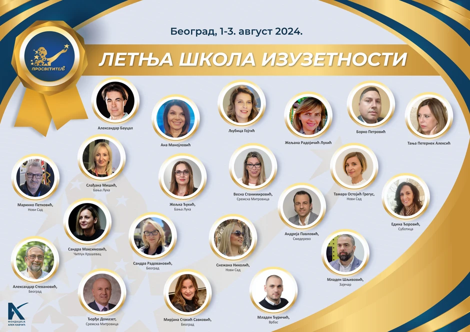"Letnja škola izuzetnosti", koju organizuje "Fondacija Alek Kavčić", biće održana od 1. do 3. avgusta 2024. godine, u Beogradu. Ovaj trodnevni događaj predstavlja najzahtevniji i najobimniji deo takmičenja za prestižnu Srpsku nastavničku nagradu "Prosvetitelj". Okupiće 15 polufinalista koji su prošli rigorozan proces selekcije.