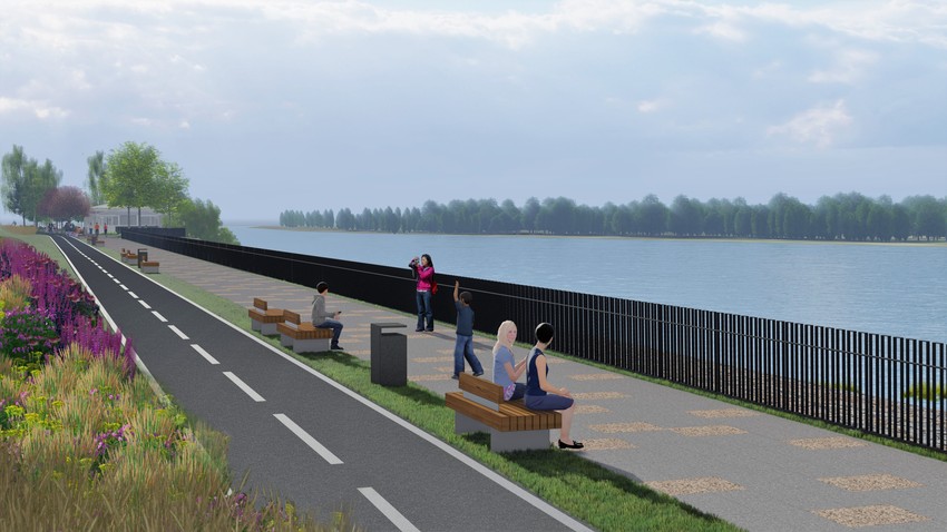 Na mestu postojećeg obezbeđenja nasipa predviđena je izrada nove betonske kaskadne zaštite nasipa. Kaskadno obezbeđenje nasipa ujedno dobija funkciju mirnog odmora sa delovima predviđenim za sedenje, odakle se otvara pogled na reku Savu.