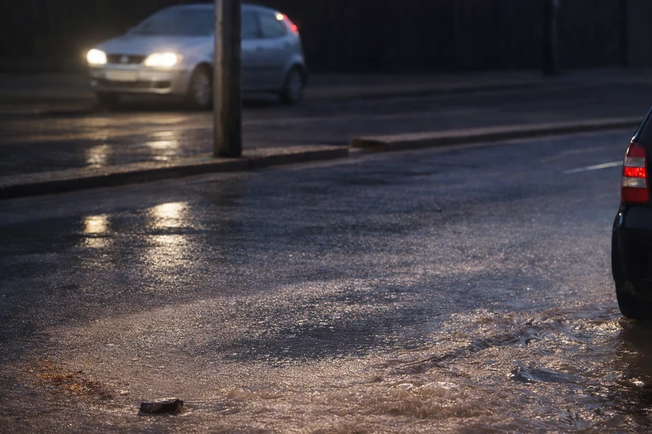 Velika količina vode sliva se niz ulicu, ugrožavajući saobraćaj zbog potencijalnog stvaranja poledice