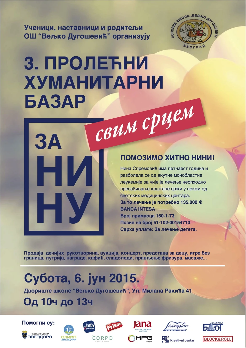 Učenici, nastavnici i roditelji OŠ "Veljko Dugošević" zajedno nastavljaju svoje učešće u akciji „Zvezdara za Ninu". Oni će se okupiti na trećem Prolećnom bazaru koji će biti održan u subotu, 6. juna, u dvorištu škole, u ulici Milana Rakića 41, sa početkom u 10 sati.