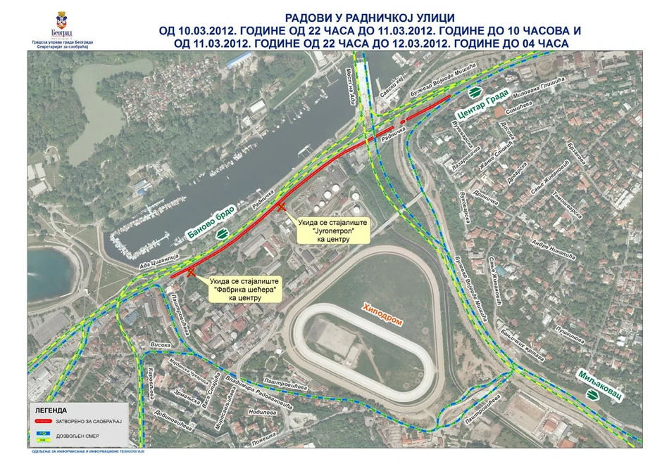 U zoni podvožnjaka u Radničkoj ulici od nedelje u 22 sata do ponedeljka u 4 sata će zbog postavljanja skele biti izmenjen režim saobraćaja. Za saobraćaj se zatvara deo Radničke ulice, u smeru od Banovog brda (Obrenovca) ka centru grada (Beogradskom sajmu) i to u delu od Paštrovićeve ulice do podvožnjaka u Radničkoj ulici.