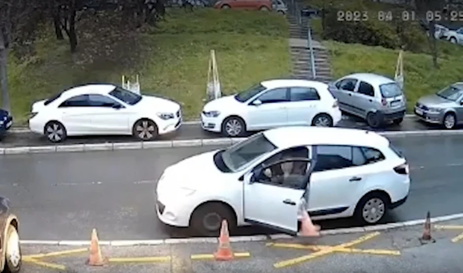 Kako se može videti na snimku, u pitanju je beli automobil. Vozač je prikočio, otvario vrata i uzeo čunj... Nije mnogo mario za kamere koje se nalaze na zgradi, nego se sa "plenom" odlazi u nepoznatom pravcu.