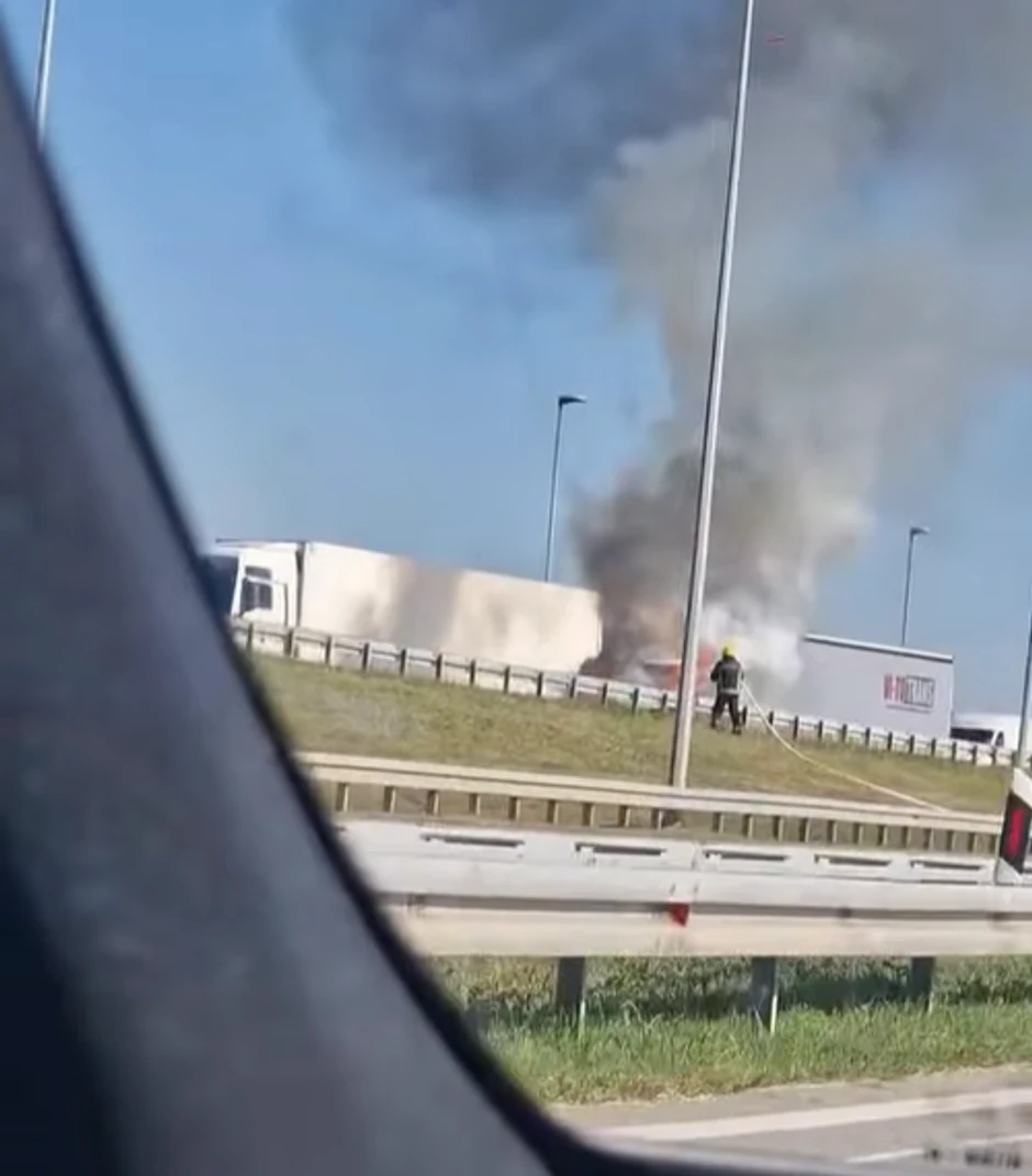 Ogromna vatra zahvatila je vozilo koje se nalazi u koloni kamiona, dok se gusti crni dim širi okolo.