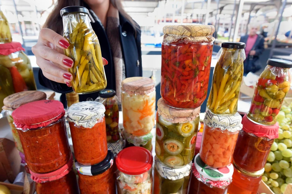 Na tezgama se osim sirovog povrća nalazi i već zgotovljena zimnica.