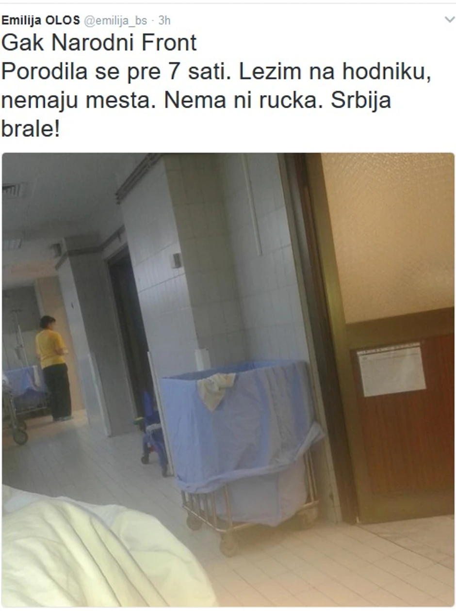 Ovo je propratni tekst uz sliku hodnika Ginekološko akušerske klinike "Narodni front", koji je jedna porodilja danas popodne objavila na svom Tviter profilu, a koji je uzdrmao društvene mreže.