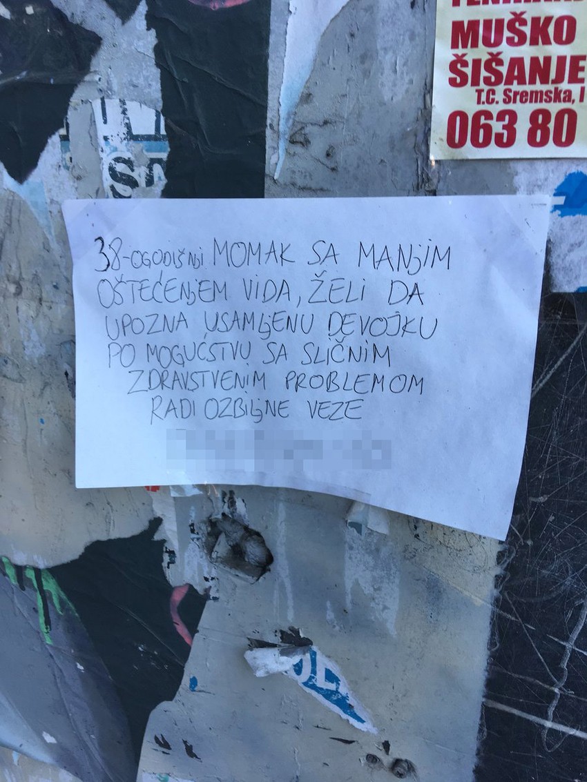 Sa ispisanim brojem mobilnog telefona na dnu papira, neženja se predstavio kao momak sa manjim oštećenjem vida koji želi da upozna usamljenu damu.