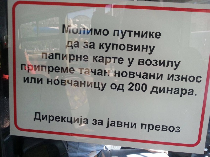 "Molimo putnike da za kupovinu papirne karte u vozilu pripreme tačan novčani iznos ili novčanicu od 200 dinara", poruka je koja se sve češće može videti u gradskom prevozu. Da li su putnici dužni da poštuju ovu molbu Direkcije za javni prevoz ili je to samo stvar njihove dobre volje?