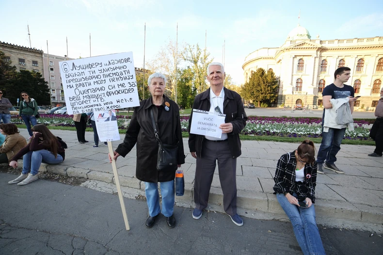 Ni na Veliki petak, grupa demonstranata "Protesta protiv diktature" nije odustala od šetnje. U znatno manjem broju nego prethodnih dana, oko par stotina učesnika su po dogovoru napravljenom na jučerašnjem okupu, prošetali do Trga republike, zgrade RTS-a i vratili se do Narodne skupštine, gde su najavili skup i za subotu.