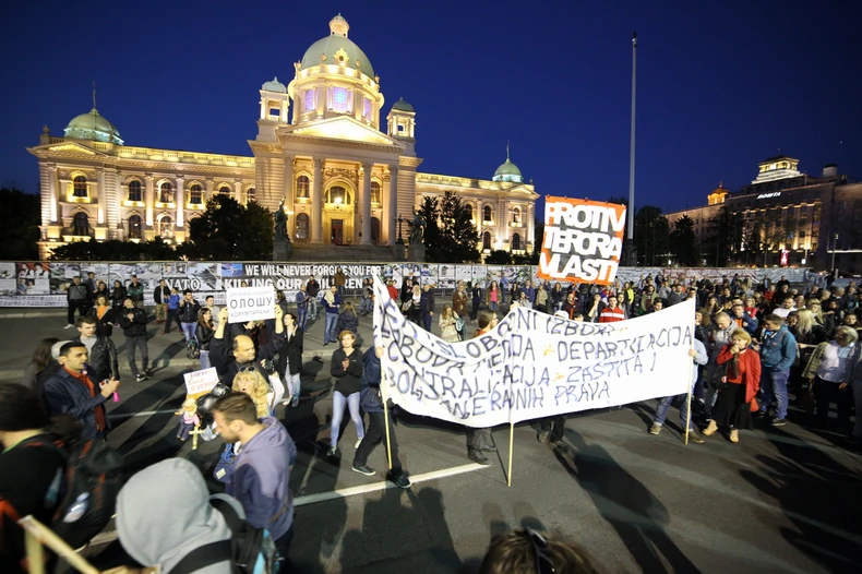 Skup je izašao na ulicu, kada je obustavljen saobraćaj na Trgu Nikole Pašića već oko 18.30 da bi kolona, predvođena dobošarima krenula ka Terazijama do Trga republike.