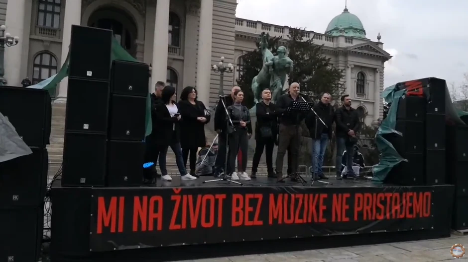 - Sa nama niko nema nikakve veze, osim muzičara koji žele svoja prava. Mi imamo drugi status, nismo muzičari, nego osuđenici koji se brane sa slobode. Prođe godina, ali dve ključne sednice nikako. Shodno prokletoj godini, javašliku, bezobrazluku i drugim stvarima, shodno svemu što želimo da sačuvamo od onih koji nemaju svoje, mi smo se okupili ovde - rekao je jedan od govornika na protestu.