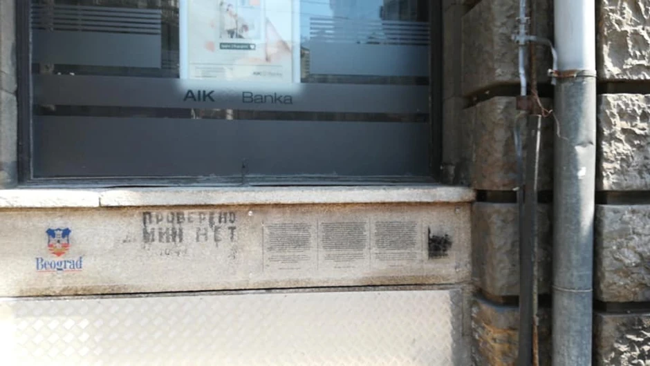 Na zgradi banke na uglu beogradskih ulica kralja Milana i kneza Miloša otkriven je natpis "Provereno, min njet" (provereno, nema mina) kojim su posle oslobođenja Beograda u Drugom svetskom ratu bile označene deminirane zgrade.