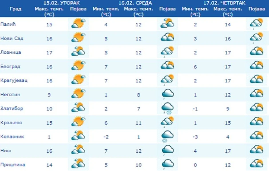 Jutarnja temperatura od 1 do 8, najviša dnevna od 10 do 13 stepeni, a u Timočkoj Krajini oko 8 stepeni.