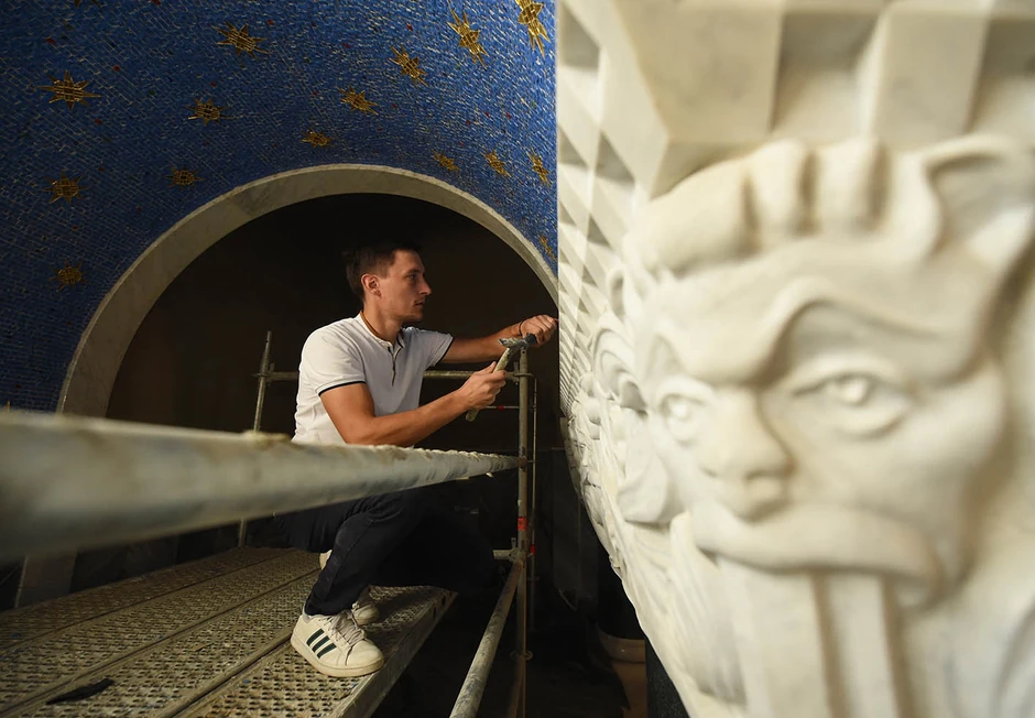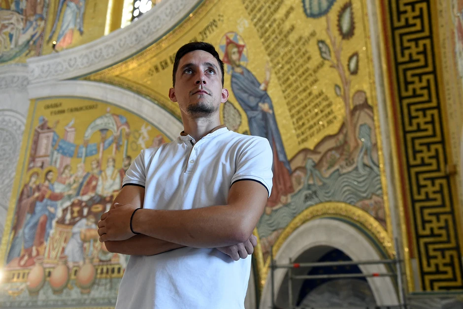 - Mi bukvalno funkcionišemo kao vojska. Prozivka je u osam sati ujutru. Ko zakasni, zna se, čisti za svima. Imamo tri pauze, jednu od sat vremena i dve od po pola sata. Svaka pauza počinje i završava se na skeli kako ne bi bilo kašnjenja. Iako je ovo umetnički posao, ima i puno fizikalije. Inače, sve mozaike u hramu smo pravili od specijalnog kamena koji se proizvodi u Moskvi i Sankt Petersburgu - naglašava mladi umetnik.