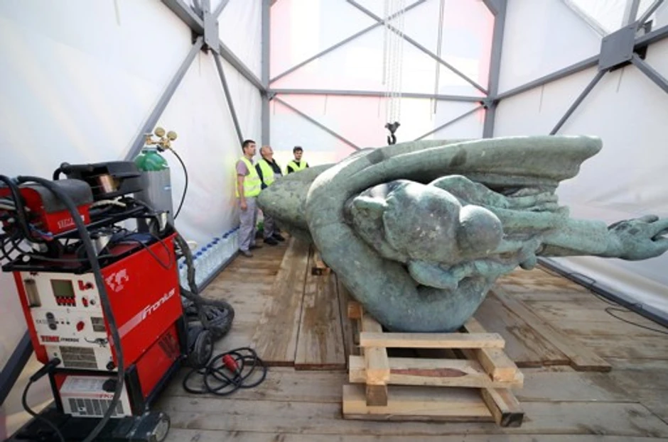 Velika statua koja simbolizuje Francusku u ratnom zamahu dok pristiže u pomoć Srbiji stajala je položena na bok u specijalno opremljenom prostoru gde vajar Zoran Kuzmanović bronzi vraća stari sjaj. Ambasador je dotakao skulpturu koja je pre 88 godina rađena u znatno skromnijim uslovima, sa oskudnim sredstvima, što je nipošto nije činilo manje veličanstvenom tokom proteklog perioda, ali su oštećenja nastala vremenom bila neizbežna.