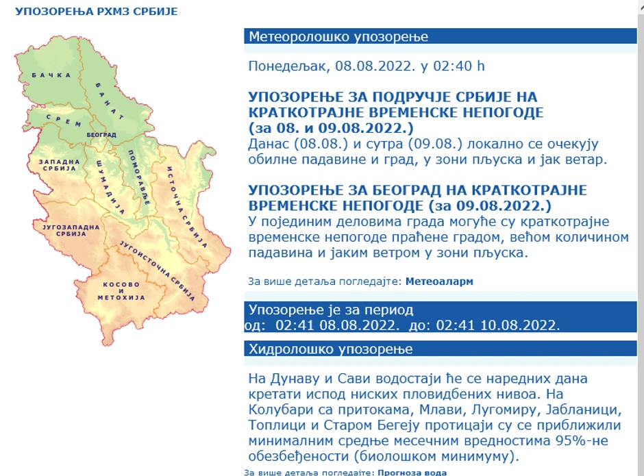 Pored upozorenja za Srbiju i Beograd, RHMZ je izdao i treće, hidrološko upozorenje, u kom piše kako će se na Dunavu i Savi vodostaji narednih dana kretati ispod niskih plovidbenih nivoa. Na Kolubari sa pritokama, Mlavi, Lugomiru, Jablanici, Toplici i Starom Begeju proticaji su se približili minimalnim srednje mesečnim vrednostima 95%-ne obezbeđenosti (biološkom minimumu).