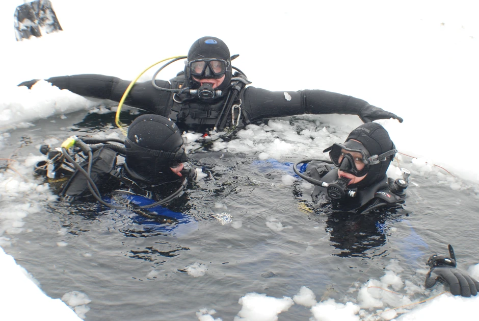 - Hladan talas prvo udara u lice. Osećaj je fenomenalan dok ronite, temperatura vode je dva stepena - priča Branka, jedina dama koja se za vikend osmelila na ronjenje pod ledom.