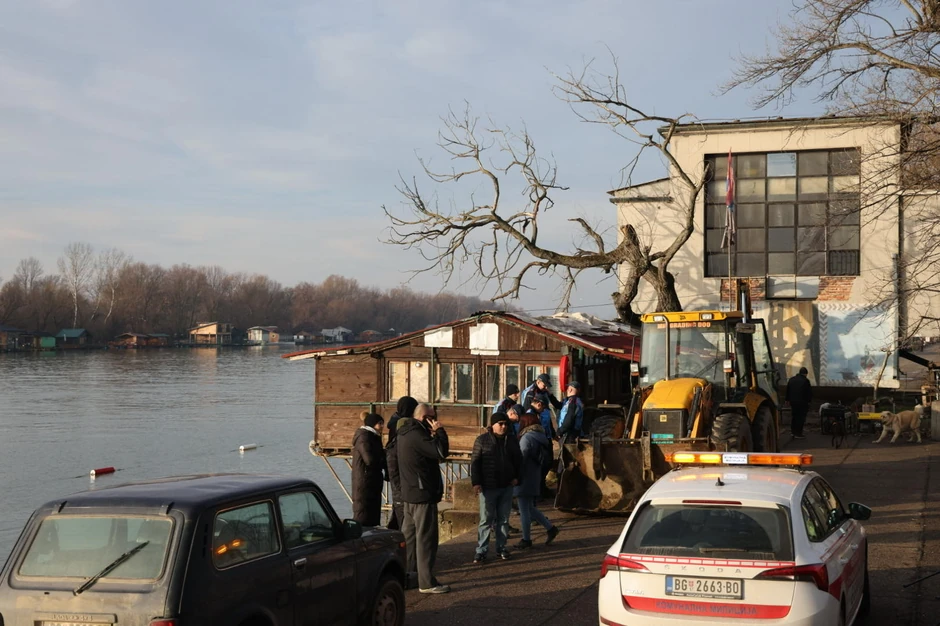 Ispred splava na obali vide se iznesene stvari, kao i radnici koji uklanjaju inventar.