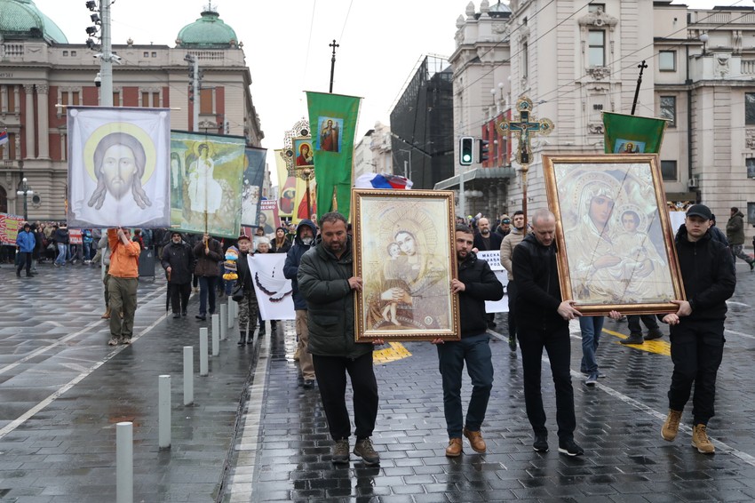 Oni su se okupili na Trgu republike oko 17 sati odakle su prošli centralnim gradskim ulicama noseći ikone, da bi se potom stacionirali na saobraćajnici ispred Doma narodne skupštine.