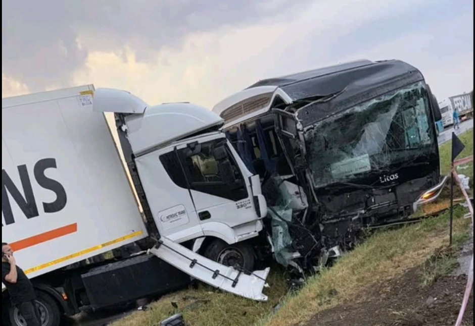 Kako se vidi na fotografiji saobraćajne nesreće, prednji deo autobusa i kamiona potpuno je smrskan, a vozila su sletela sa puta