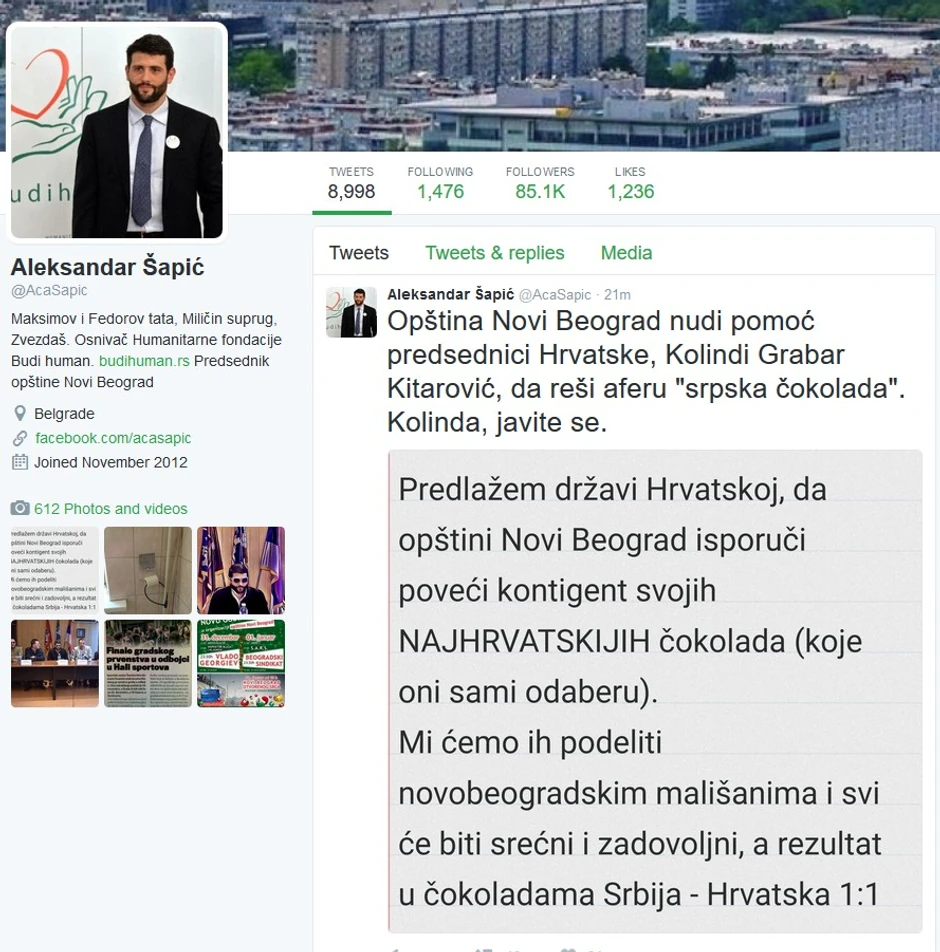 "Predlažem državi Hrvatskoj, da opštini Novi Beograd isporuči poveći kontingent svojih NAJHRVATSKIJIH čokolada (koje oni sami odaberu). Mi ćemo ih podeliti novobeogradskim mališanima i svi će biti srećni i zadovoljni, a rezultat u čokoladama Srbija - Hrvatska 1:1", napisao je Šapić na svom tviter profilu.