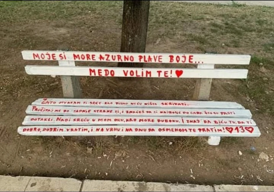 Poruka glasi ovako: "Moje si more azurno plave boje... Medo volim te", napisano je na naslonu klupe, a zatim, na delu koji je predviđen za sedenje piše "zato otvaram ti srce kao pismo, neću ništa skrivati. Pročitaj me do zadnje strane ti, i znaćes da si najbolje do sada što su prsti dotakli. Nađi sreću u mom oku, kao more duboku. I znaj da biću tu da ti dobro dobrim vratim, i na vrhu i na dnu da osmehom te pratim".