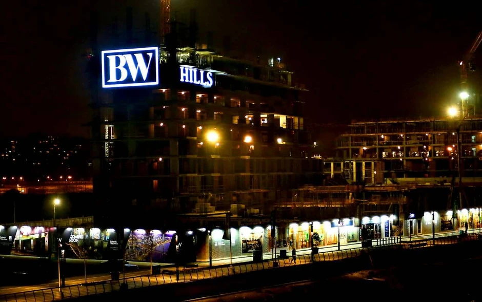 Nije reč o novogodišnjoj rasveti, već o logou velikog projekta na obali Save, koji je okačen na jednu od sve stambene kule, čija izgradnja je u punom jeku.