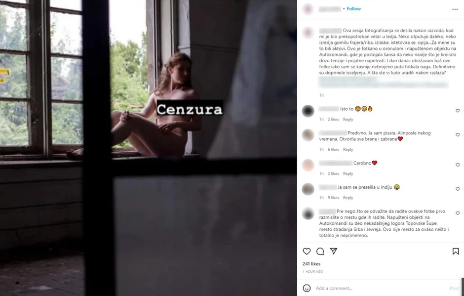 - Ova sesija fotografisanja se desila nakon razvoda, kad mi je bio prekopotreban vetar u leđa. Neko otputuje daleko, neko izređa gomilu frajera/riba, izlaske, istetovira se, opija... Za mene su to bili aktovi. Ovo je fotkano u oronulom i napuštenom objektu na Autokomandi, gde je postojala šansa da neko naiđe što je kreiralo dozu tenzije i prijatne napetosti. I dan danas obožavam baš ove fotke, iako sam se kasnije nebrojano puta fotkala naga. Definitivno su doprinele isceljenju. A šta ste vi ludo uradili nakon razlaza?" - napisala je ona ispod fotografije.