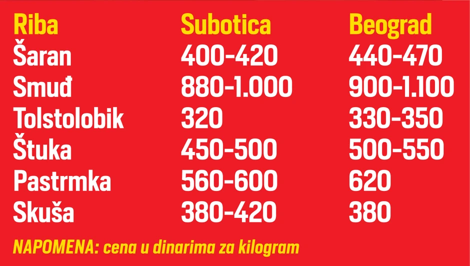 - Nije, ipak, baš sve poskupelo. Šaran je na pijaci jeftiniji u odnosu na prošlu godinu za oko 50 dinara i sada je 400-420 dinara. Smuđ je od 880 do 1.000, a pastrmka 560 do 600 dinara. Skuša je poskupela sa 380 na 420 dinara - zaključuje ova Subotičanka.