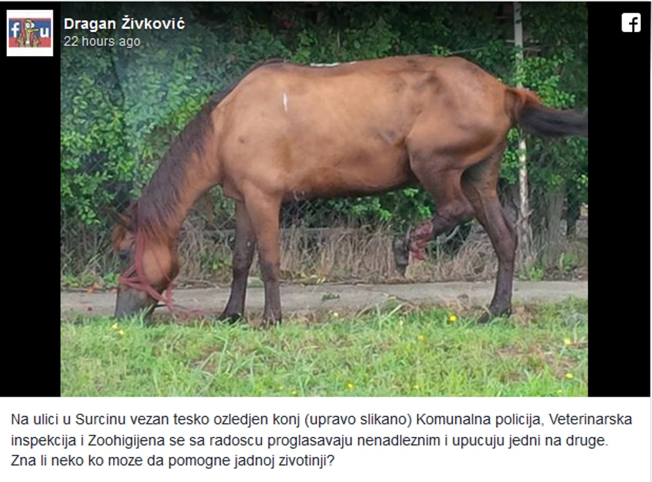 Slika konja bez zadnje leve noge, koji je ostavljen sasvim sam u Surčinu, osvanula je na internetu i slomila srce svima koji su je videli.