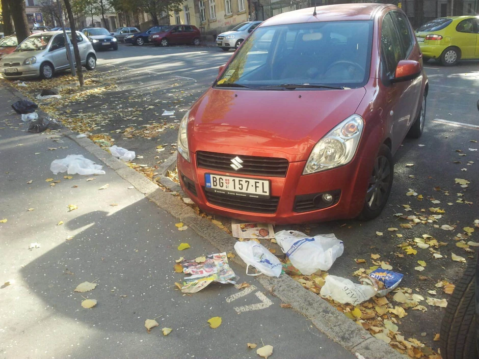 Smeće se nalazi po trotaru i parkingu, a vetar ga nosi između automobila gde se samo gomila.