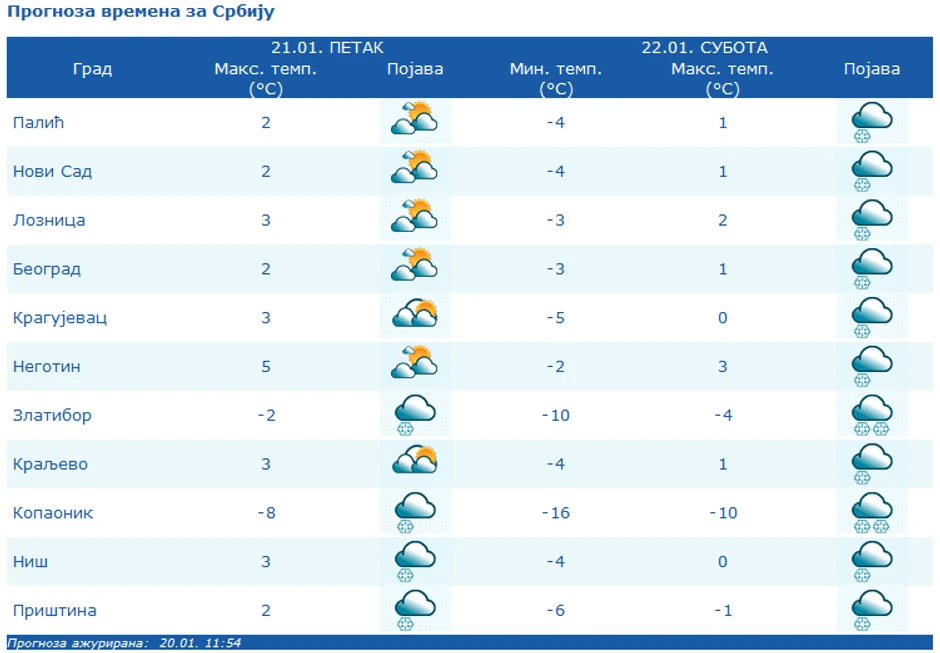 Duvaće umeren i jak severozapadni vetar, a najniža temperatura kretaće se od -5 do 1 stepen, najviša od 1 do 5 stepeni.