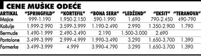 Kako je muška garderoba, uvek nešto skuplja od ženske, majice se prodaju po cenama od 490 do 2.450, a košulje koštaju od 1.190 do 3.999 dinara. Za muške bermude treba izdvojiti od 1.490 do 3.490, dok pantalone koštaju od 1.390 do 3.999 dinara.