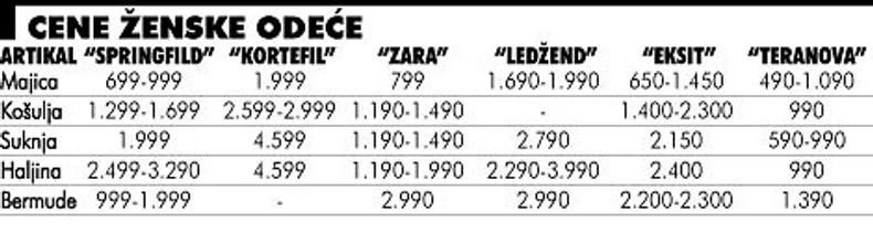 990 do 2.999 dinara. Za letnju haljinu treba izdvojiti od 990 do 4.599, dok suknje staju od 590 do 4.599 dinara.