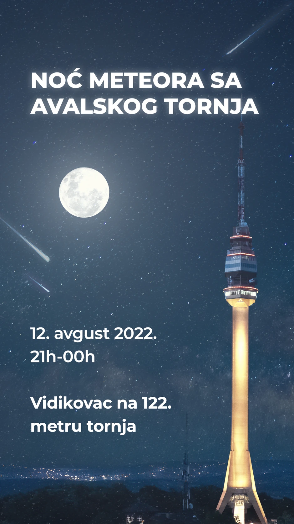 Prvi put će u petak za posetioce biti otvoren Avalski toranj do ponoći, kako bi imali priliku da sa vidikovca na 122 metru, uživaju u jedinstvenoj noći! Povod je posmatranje meteorskog roja Perseidi, koji su svake godine ukoliko je vedro, u avgustu vidljivi golim okom.
