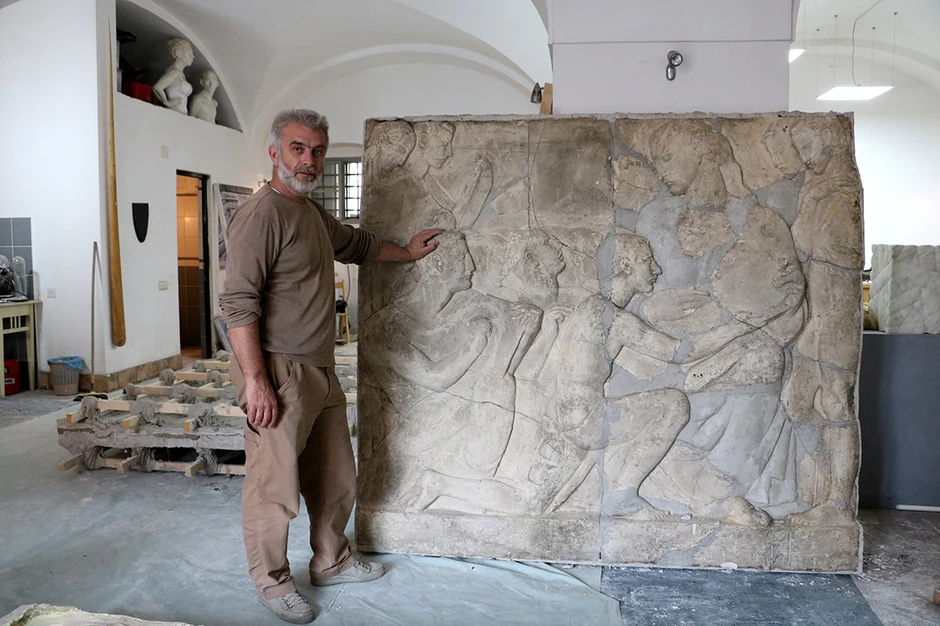 - To ispred vas je originalan pozitiv bareljefa “Sorbone”, napravljen 1965. na osnovu negativa sa gipsanih modela iz Galerije "Meštrović" u Splitu. Pozitiv sam dobio u delovima koje sam spojio, a na osnovu fotografija iz ranijeg perioda i originala u potpunosti sam ga rekonstruisao. Ispod je gumeni kalup koji sam koristio da napravim radnu kopiju. Na osnovu nje će se isklesati novi bareljef, na isti način kojim su to davno radili Meštrovićevi učenici i neće biti nikakve razlike u izgledu. Trenutno radimo kopiju i za "Ratnike", a uskoro nam stiže i kamen iz Italije koji ćemo da klešemo - objasnio nam je Čpajak.
