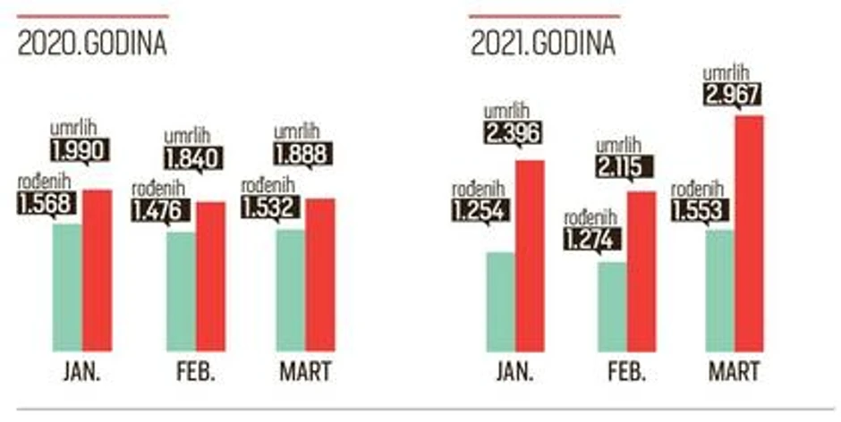 Iako ovi podaci ohrabruju, treba imati u vidu da smo 2021. od početka godine do kraja marta imali 33.535 umrlih, što je čak 28.9 odsto više nego u istom periodu prošle godine.