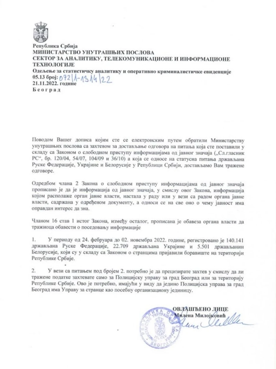 Broj državljana Ruske Federacije koji je došao u Srbiju je 140.141, iz Ukrajine je došlo 22.709 ljudi, dok je iz Belorusije došlo 5.501 ljudi, saopštilo je Ministarstvo unutrašnjih poslova Srbije.